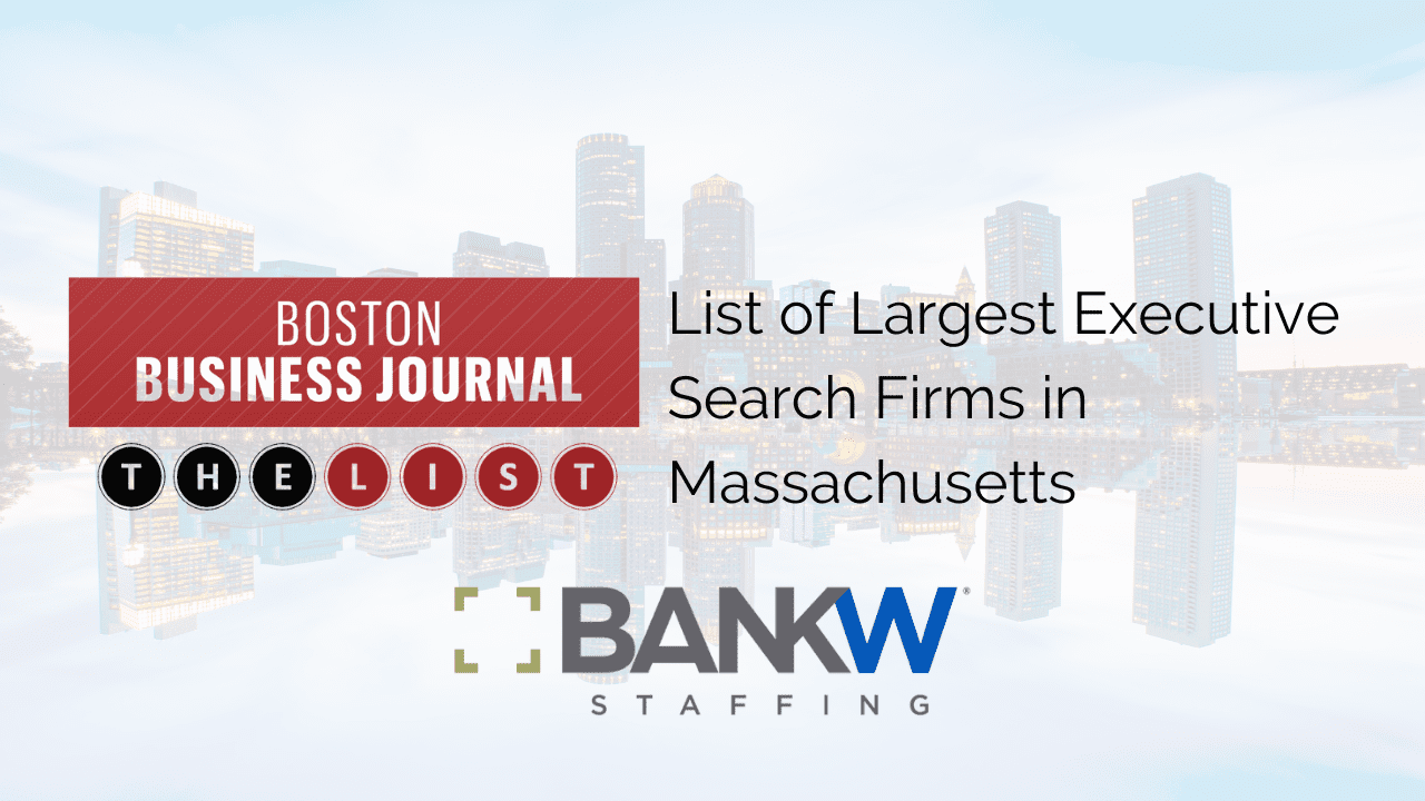BANKW is ranked #8 on the Boston Business Journal’s list of Largest Executive Search Firms in Massachusetts. This list recognizes BANKW Staffing’s success in placements of individuals in full-time executive-level jobs paying at least $100,000/year. BANKW Staffing places executive search candidates in finance, accounting, technology, human resources, legal, administration, health care, marketing, sales, and customer service industries throughout New England.